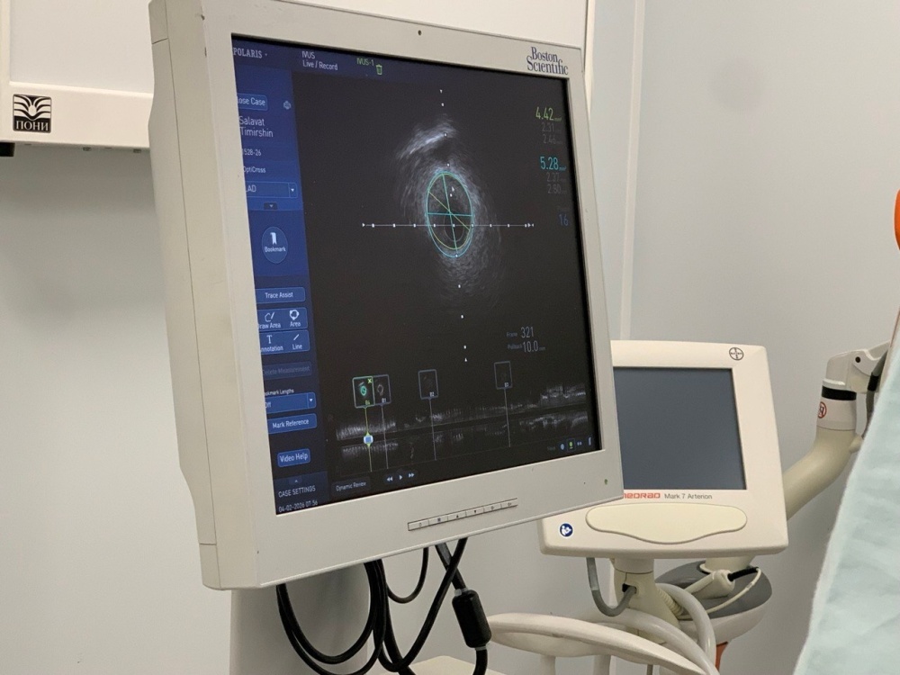 “Внутрисосудистое ультразвуковое исследование – это самый современный высокотехнологический метод внутрисосудистой визуализации коронарных артерий. Мы заводим тонкий ультразвуковой датчик диаметром всего 1 мм в коронарную артерию и смотрим структуру самой артерии изнутри,определяем степень сужения и протяженность поражения артерии ,а также оцениваем морфологию атеросклеротической бляшки,» - рассказывает заведующий Отделением рентгенохирургических методов диагностики и лечения (РХМДЛ) Бикташев Ренат Марисович.